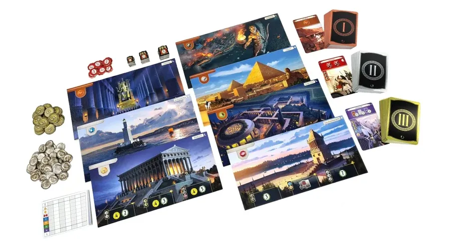A 7 Csoda – 2. kiadás doboza egy teljes értékű, sokszor újrajátszható stratégiai játékhoz szükséges elemeket tartalmazza: