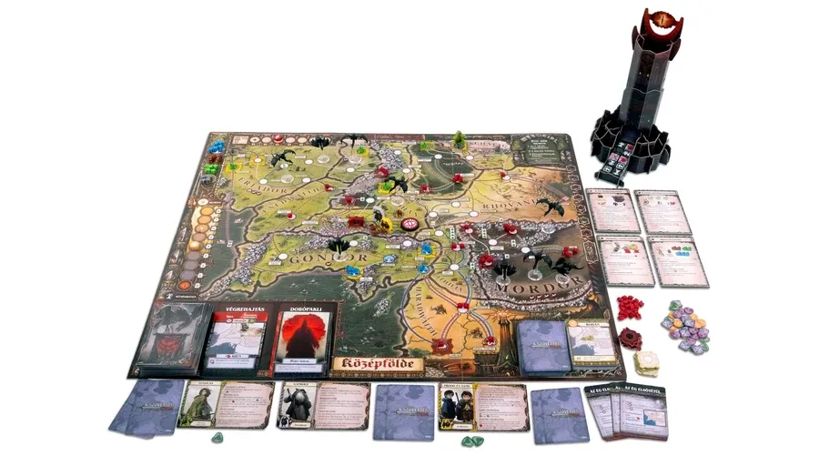 A játéktábla Középfölde térképét mutatja, ismert helyszínekkel: Megye, Völgyzugoly, Mória, Rohan, Gondor, Mordor és még sok más ikonikus régió. A Szövetség hősei színes figurákkal, a nazgûlok fekete, fenyegető miniatűrökkel jelennek meg.